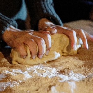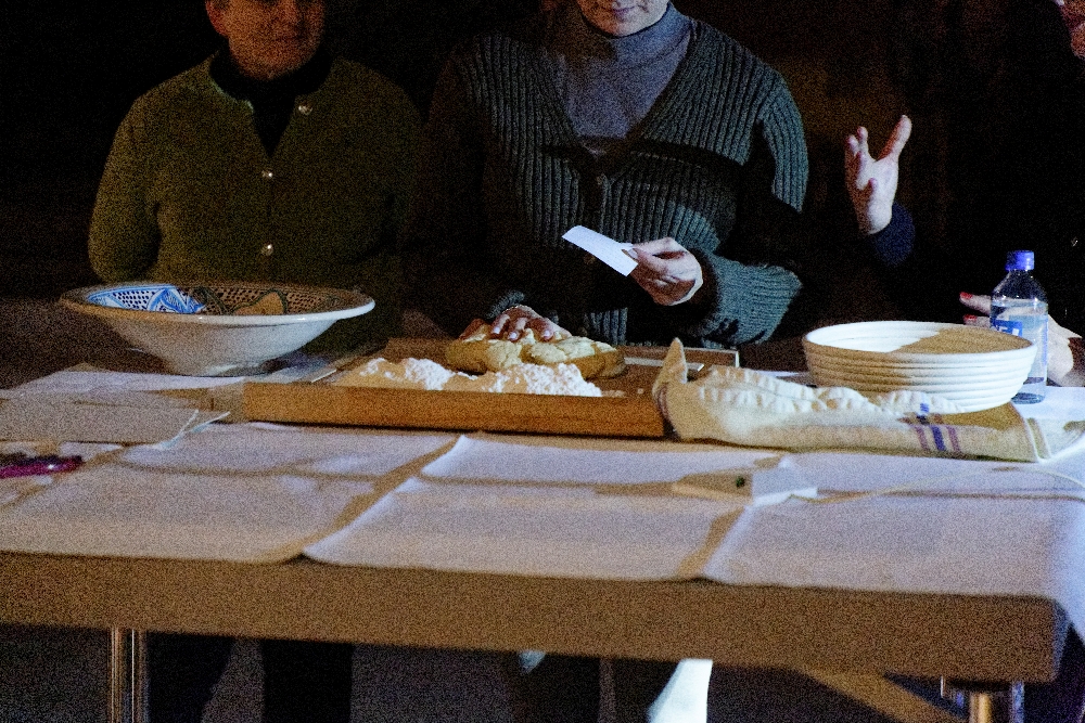 Eine Frau knetet einen Brotteig und knetet kleine Zettel ein, auf die die Besucher*innen der Performance Hoffnungen, Wünsche, Sehnsüchte geschrieben haben. Alle sind mitten im Geschehen beteiligt. Brot, das Grundnahrungsmittel der Menschen umfasst unsere grundlegenden Wünsche nach satt werden, nach versorgt werden, nach Glück und Gemeinschaft.