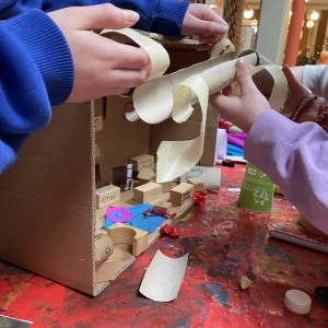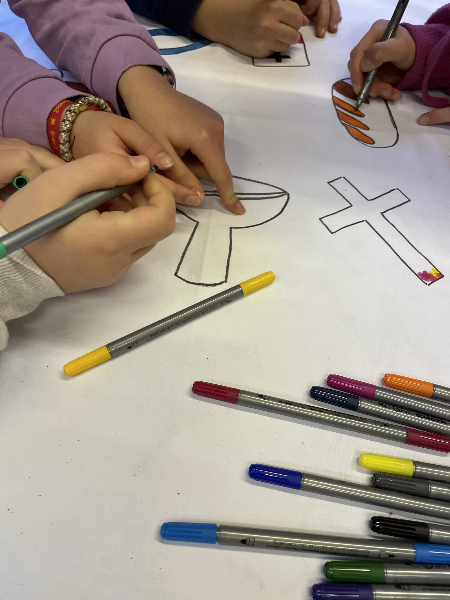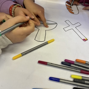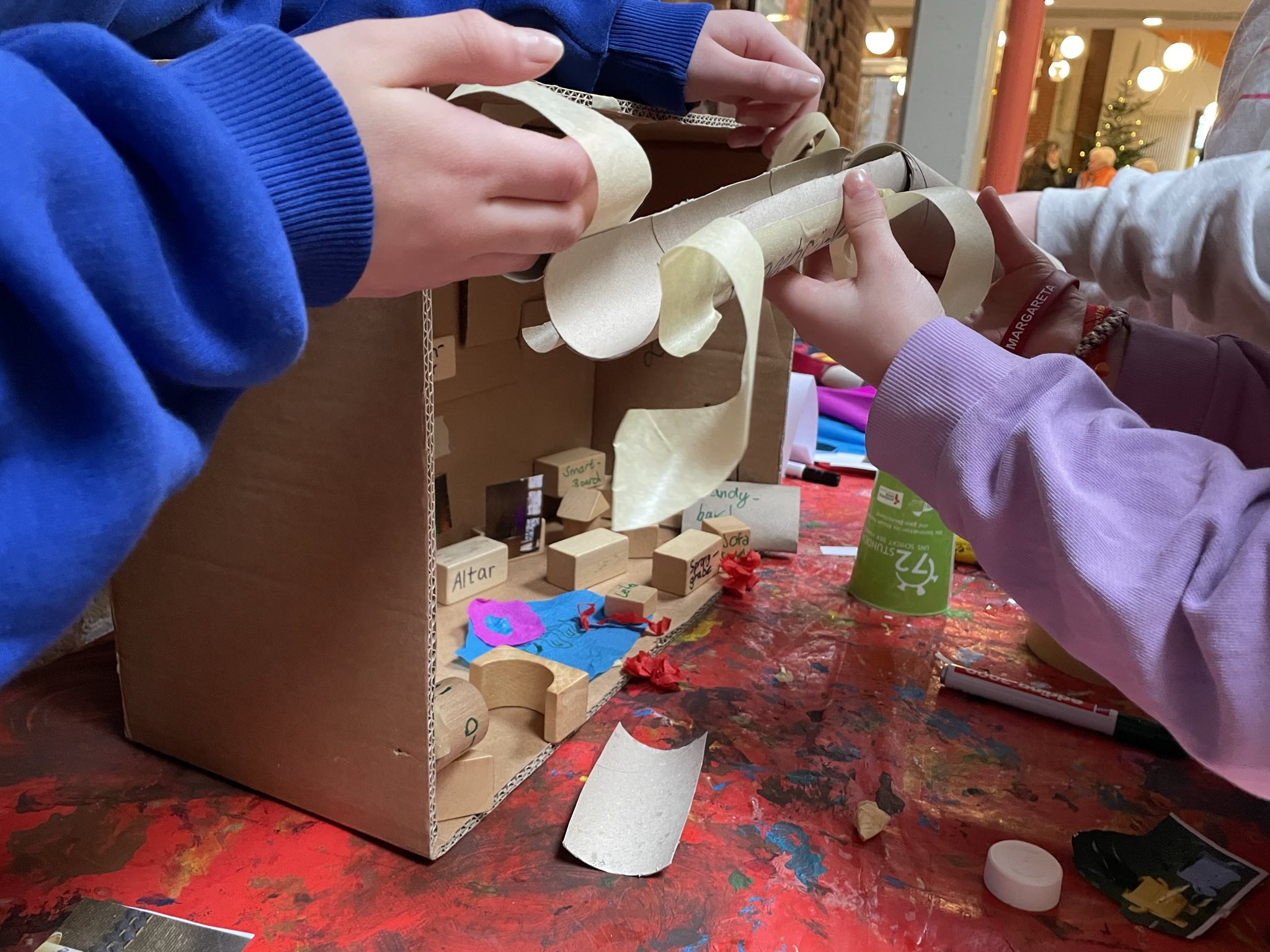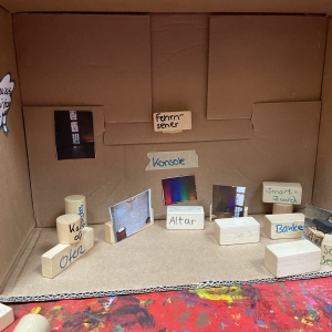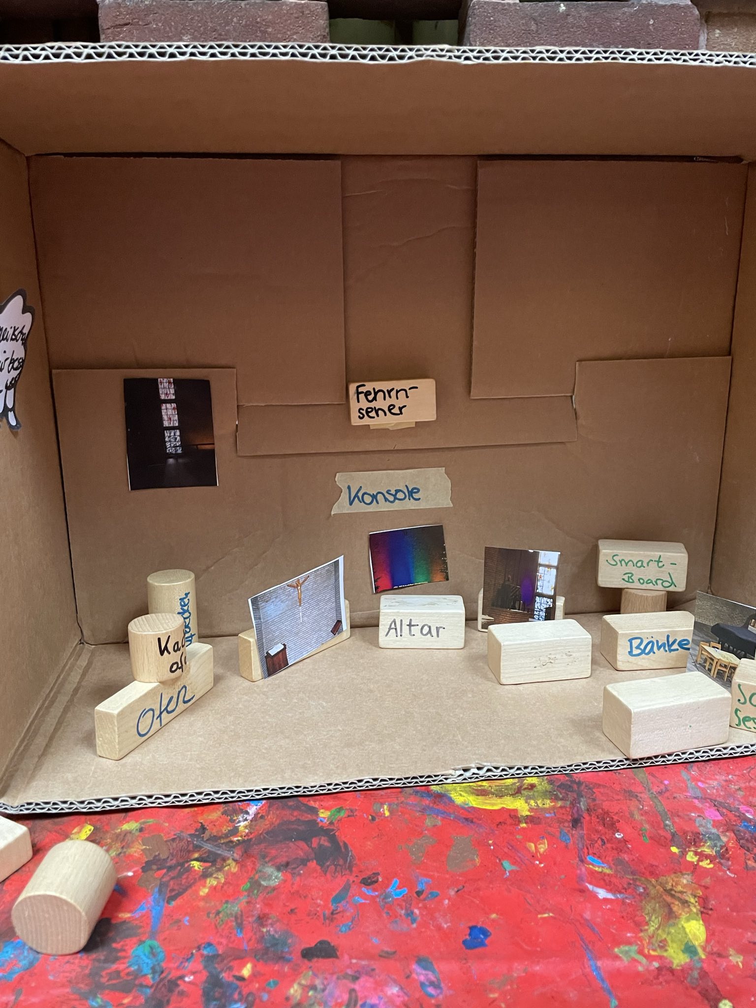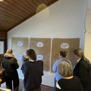 Mit viel Energie, wie sie schon damals beim Bau der Kirche von der Gemeinde aufgebracht wurde, wurde danach auf die zukünftige kurz- und mittelfristige Arbeit am Kirchort geschaut. In einem methodisch vorbereiteten, kreativen Austausch konnten die Teilnehmenden an vier Stationen ihre Gedanken und Ideen einbringen: zur Nutzung des Pfarrheims, zur Weiterentwicklung von Gottesdienstangeboten und zur grundlegenden Frage, was einen Raum eigentlich zu einem Gottesdienstraum macht.