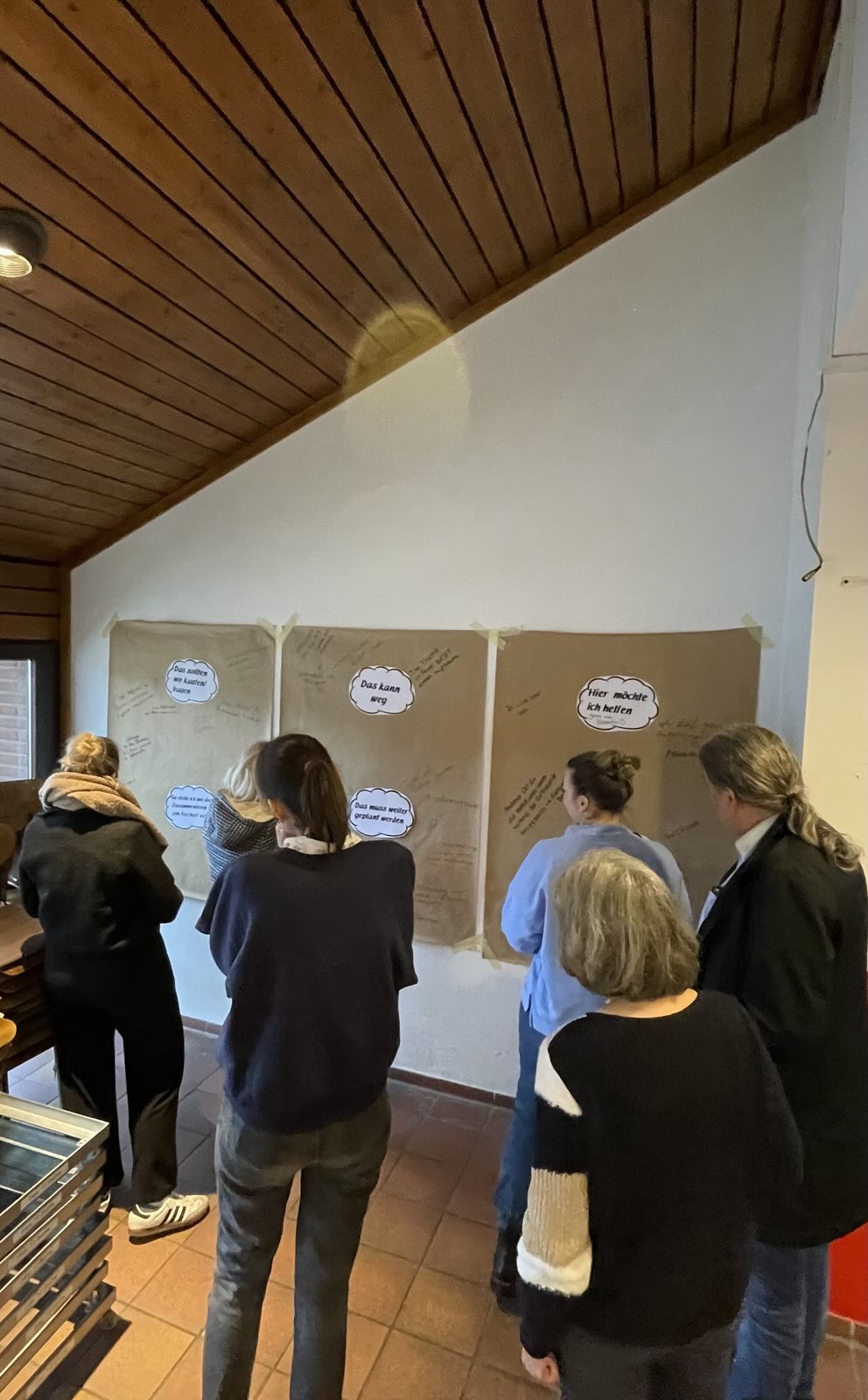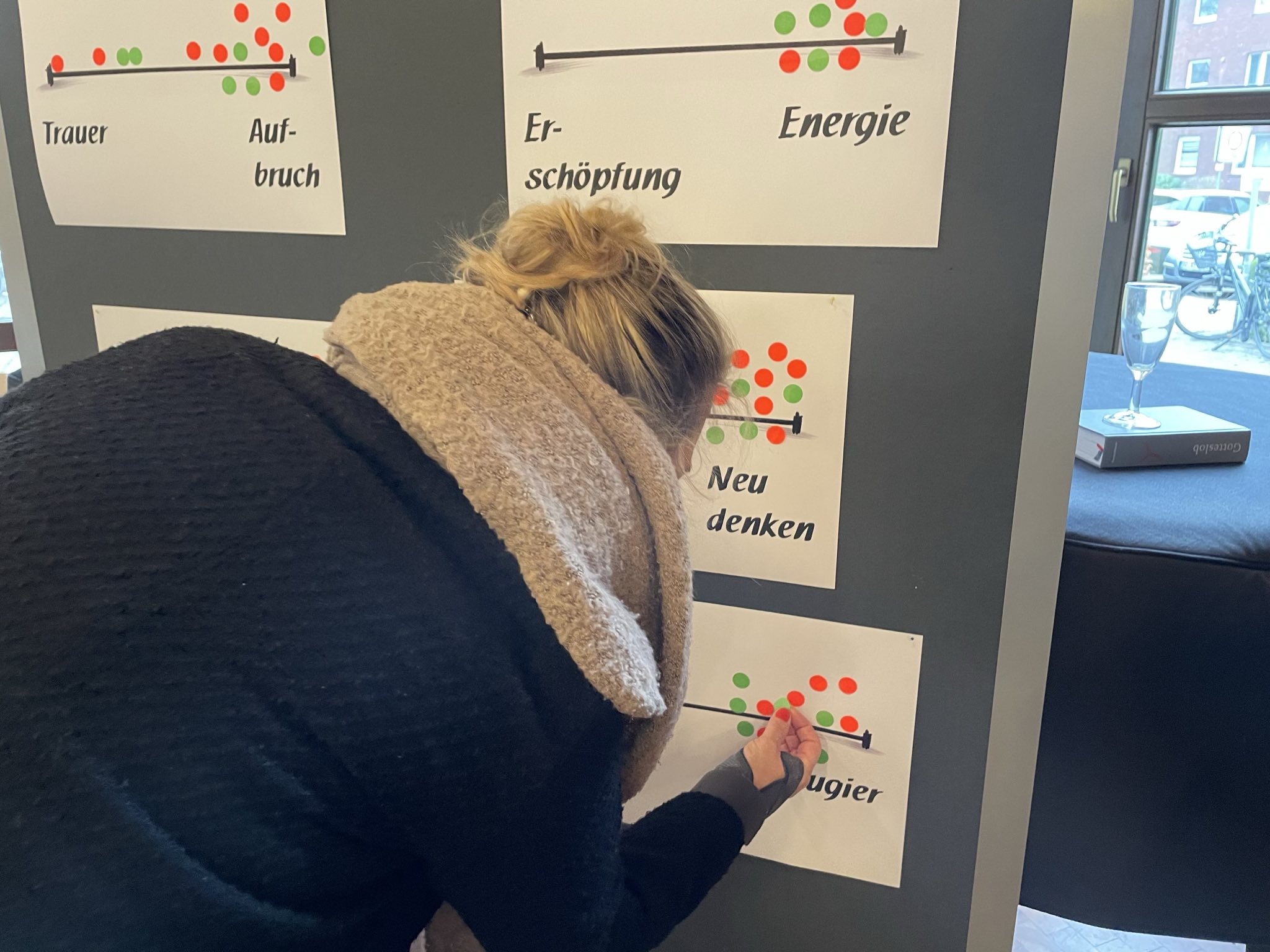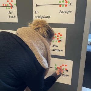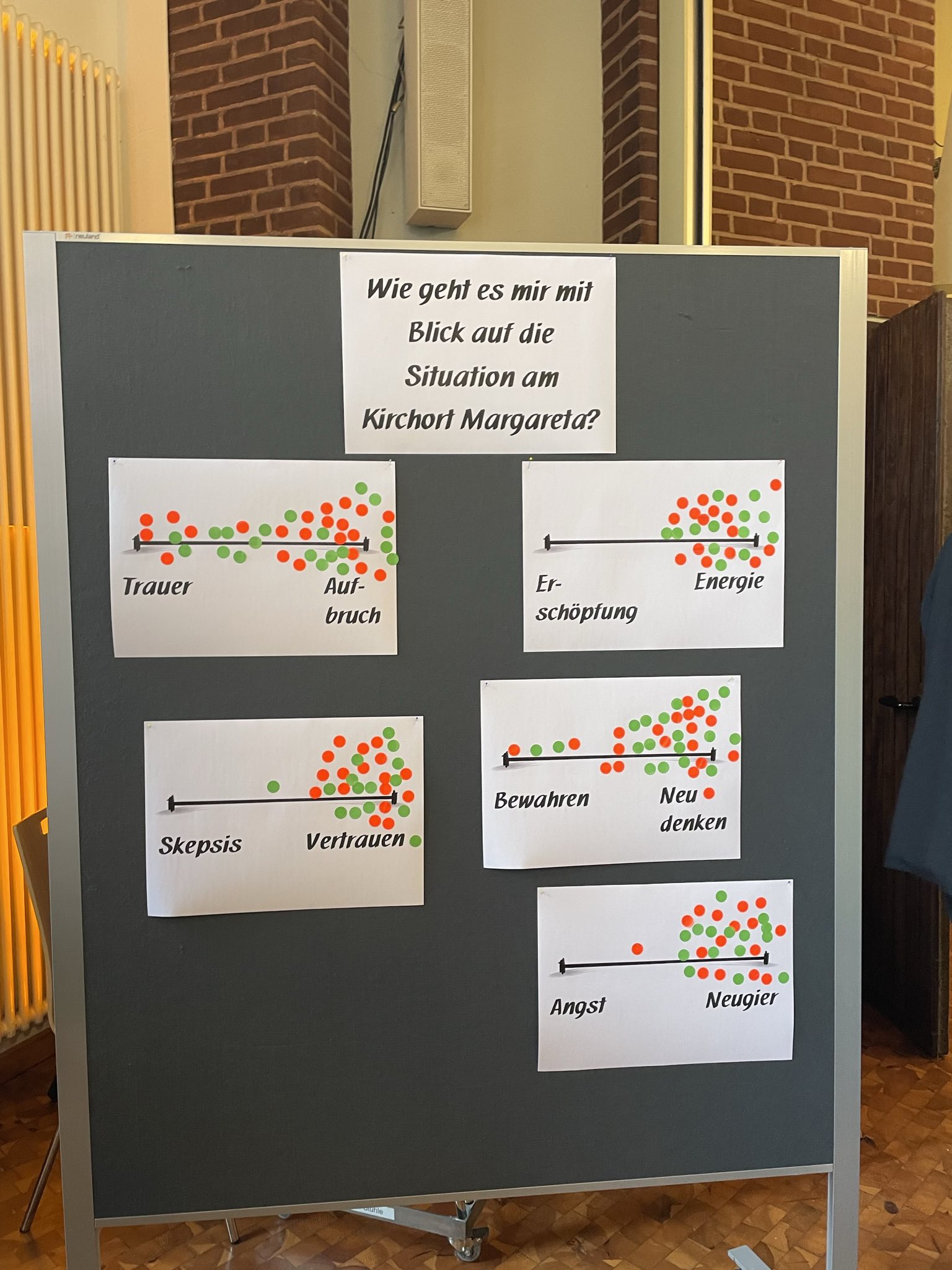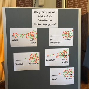 Besonders eindrücklich war eine Gefühls-Skala, auf der die aktuelle persönliche Stimmung eingetragen werden konnte. Trauer über den Verlust des vertrauten Kirchenraums waren sichtbar – deutlich größer aber war Aufbruchsstimmung, Energie und Motivation, Neues zu gestalten.