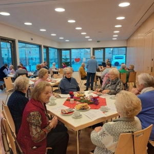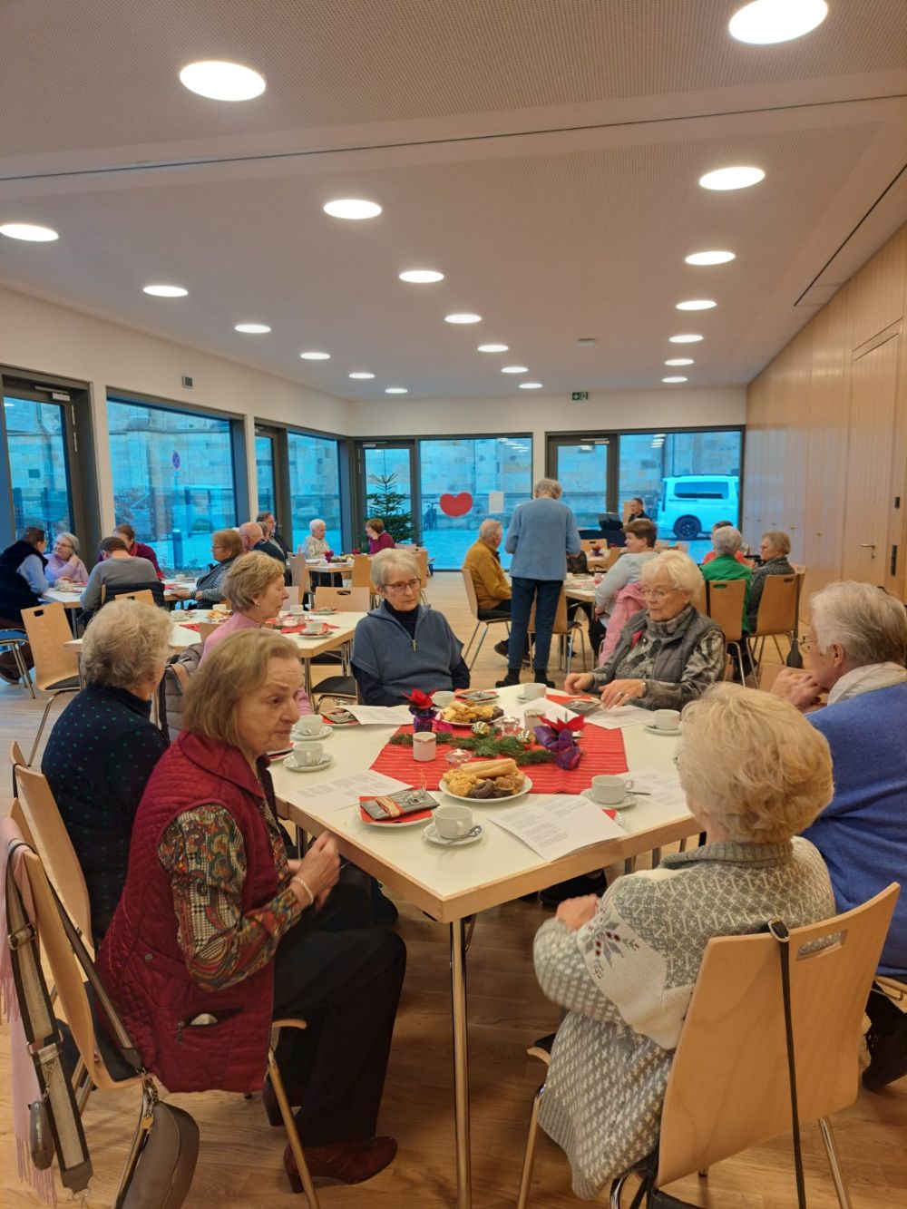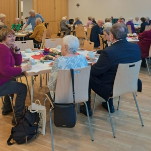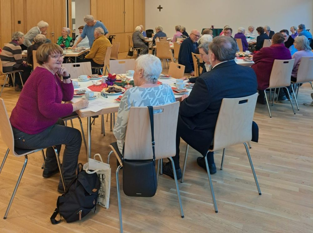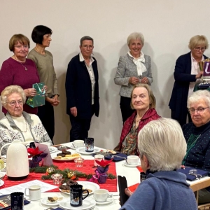 Viele Frauen und auch Männer waren der Einladung gefolgt und erlebten nach einem Impuls von Bernadette Alfert einen Nachmittag mit einem abwechslungsreichen Programm zu Kaffee und hauptsächlich selbstgebackenen Plätzchen. Dass das Thema dieses Jahr mit Engeln zu tun hatte, konnten die Anwesenden sofort sehen, an jedem Platz fanden sie schon vorweg ihr Geschenk, einen vom Leitungsteam selbstgebastelten Engel aus Draht.