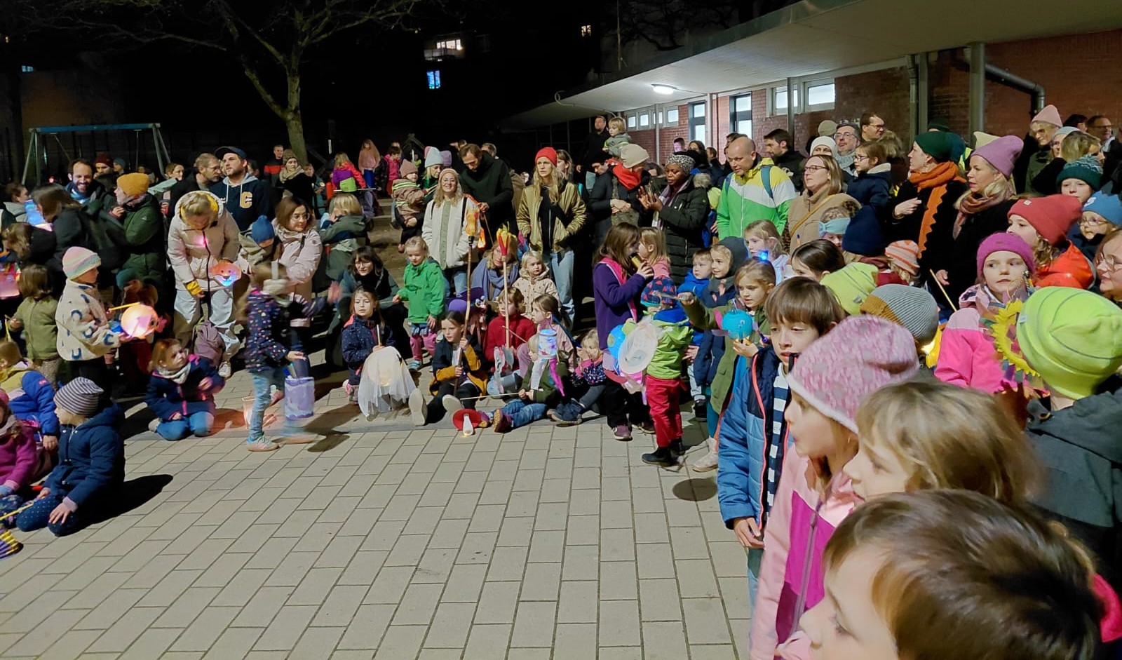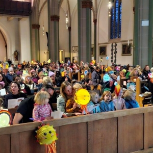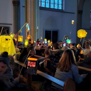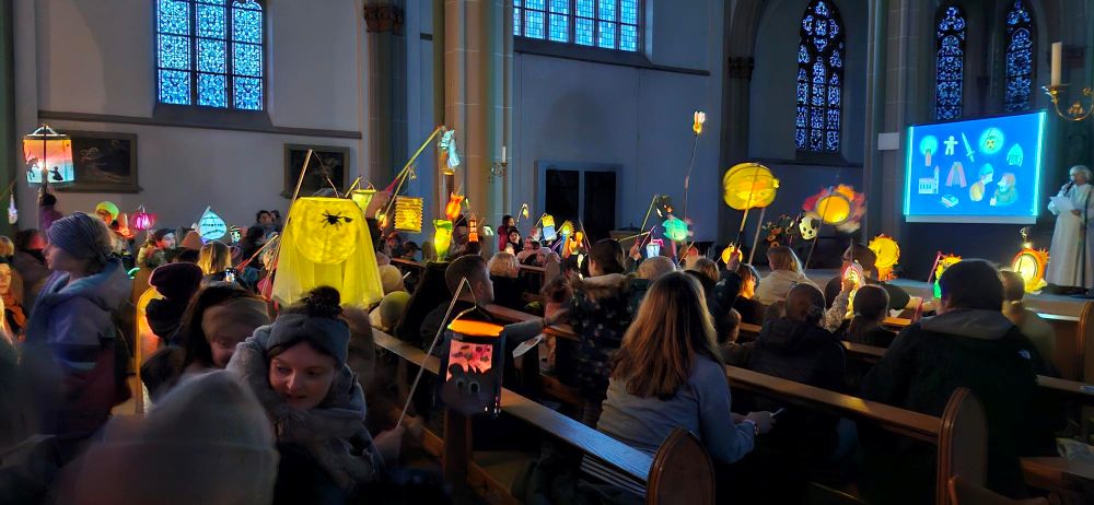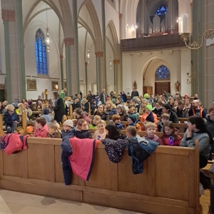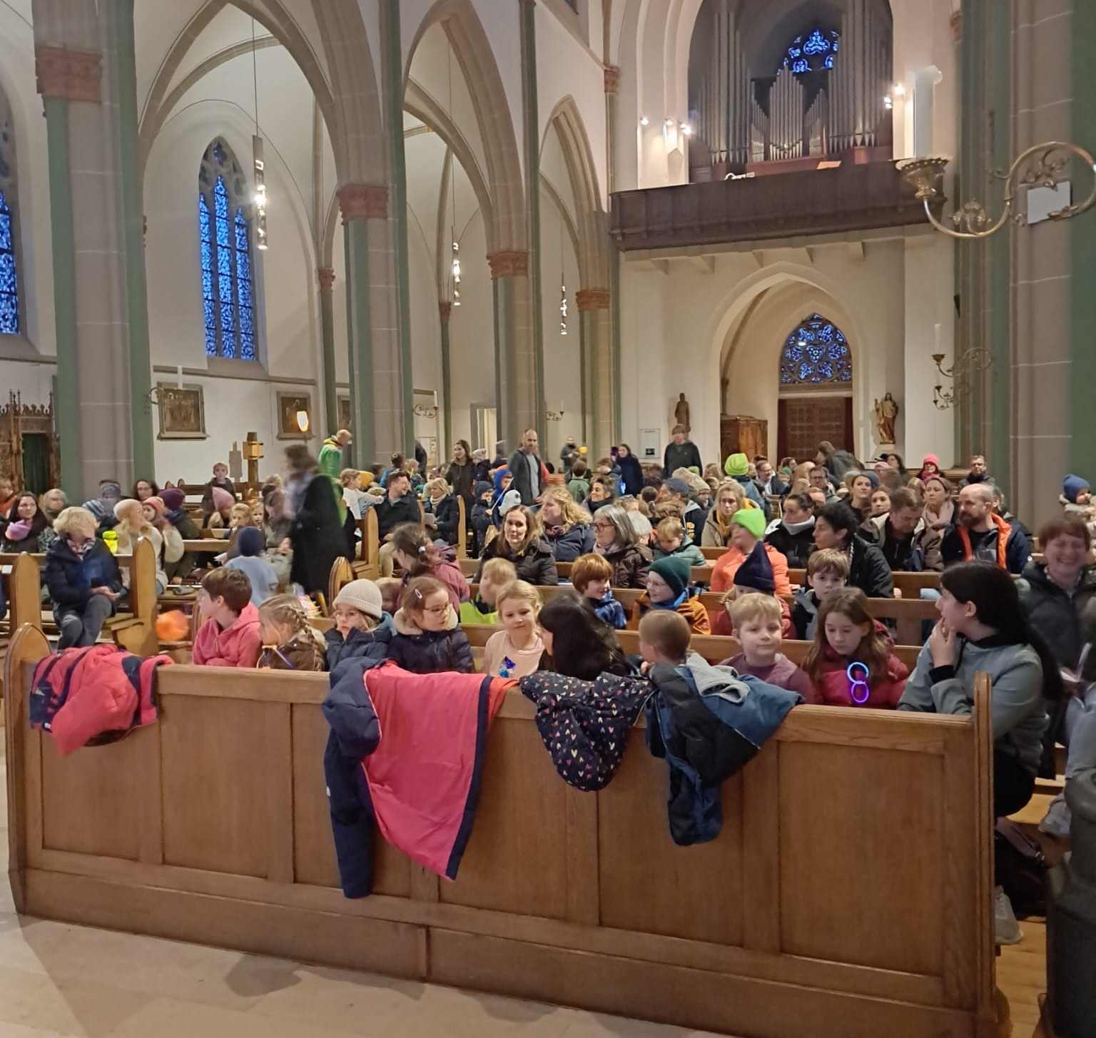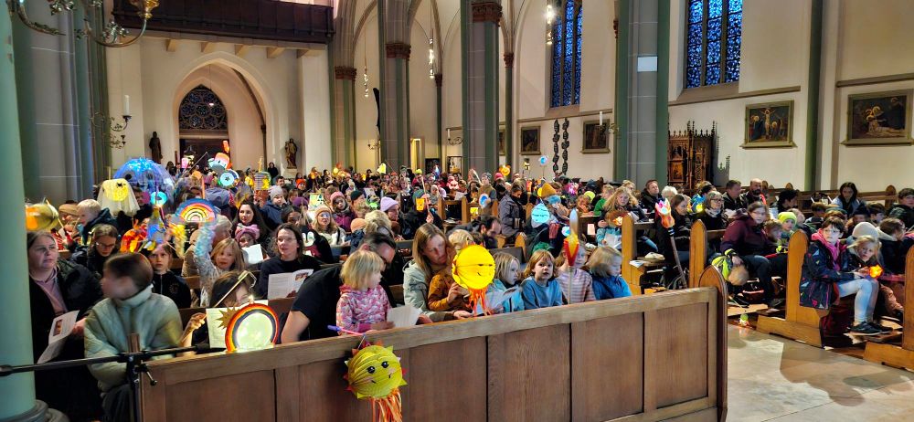 Leuchtende Laternen, wohin man schaute: Rasch füllte sich die Herz-Jesu-Kirche am Martins-Tag mit begeisterten Kindern, ihren Eltern und Großeltern, die sich mit der Geschichte des Heiligen, mit Liedern und kurzen Gebeten auf den Martins-Zug vorbereiten wollten. Er führte eine schier unendlich lange Prozession über den Hohenzollernring zur Overberg-Grundschule.