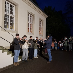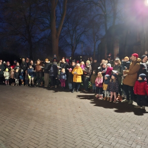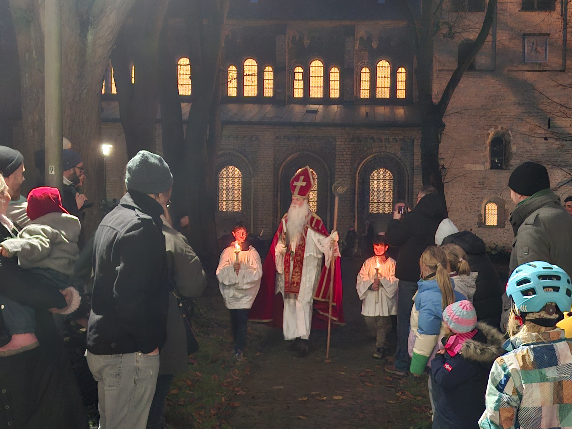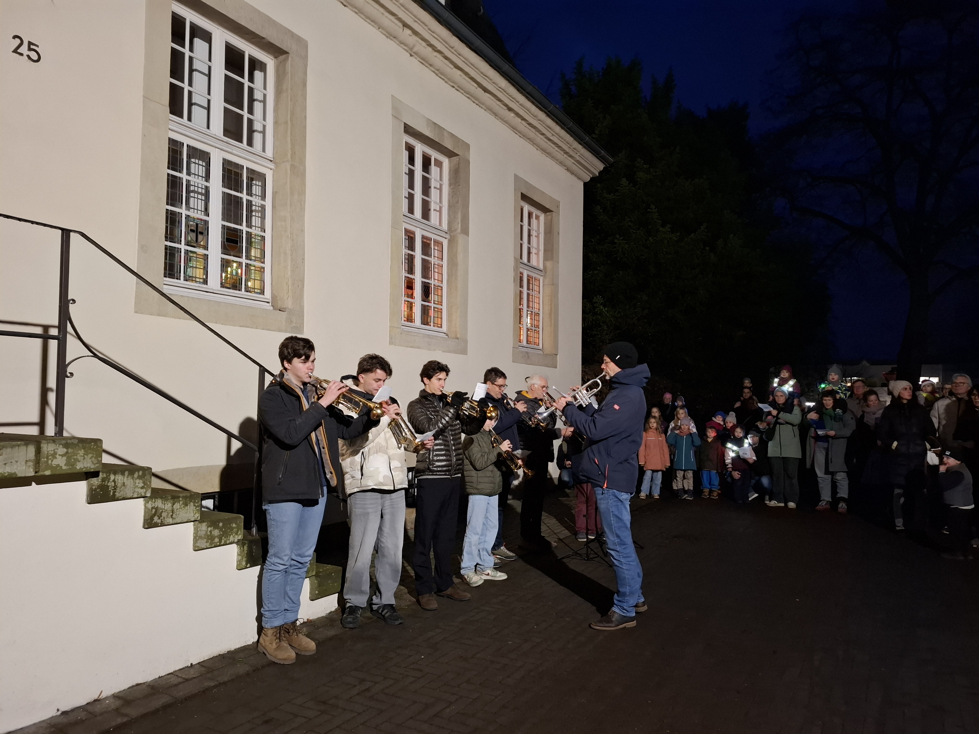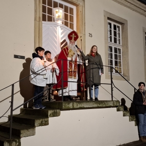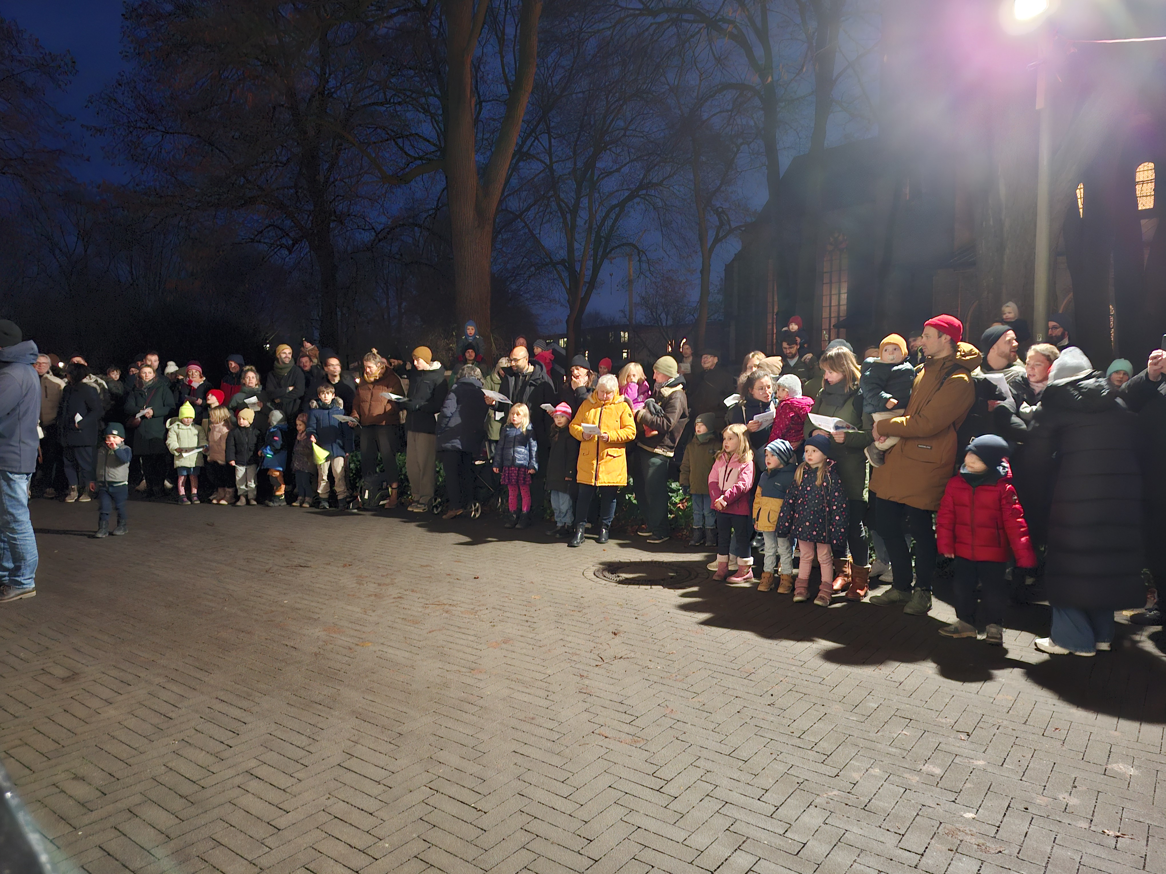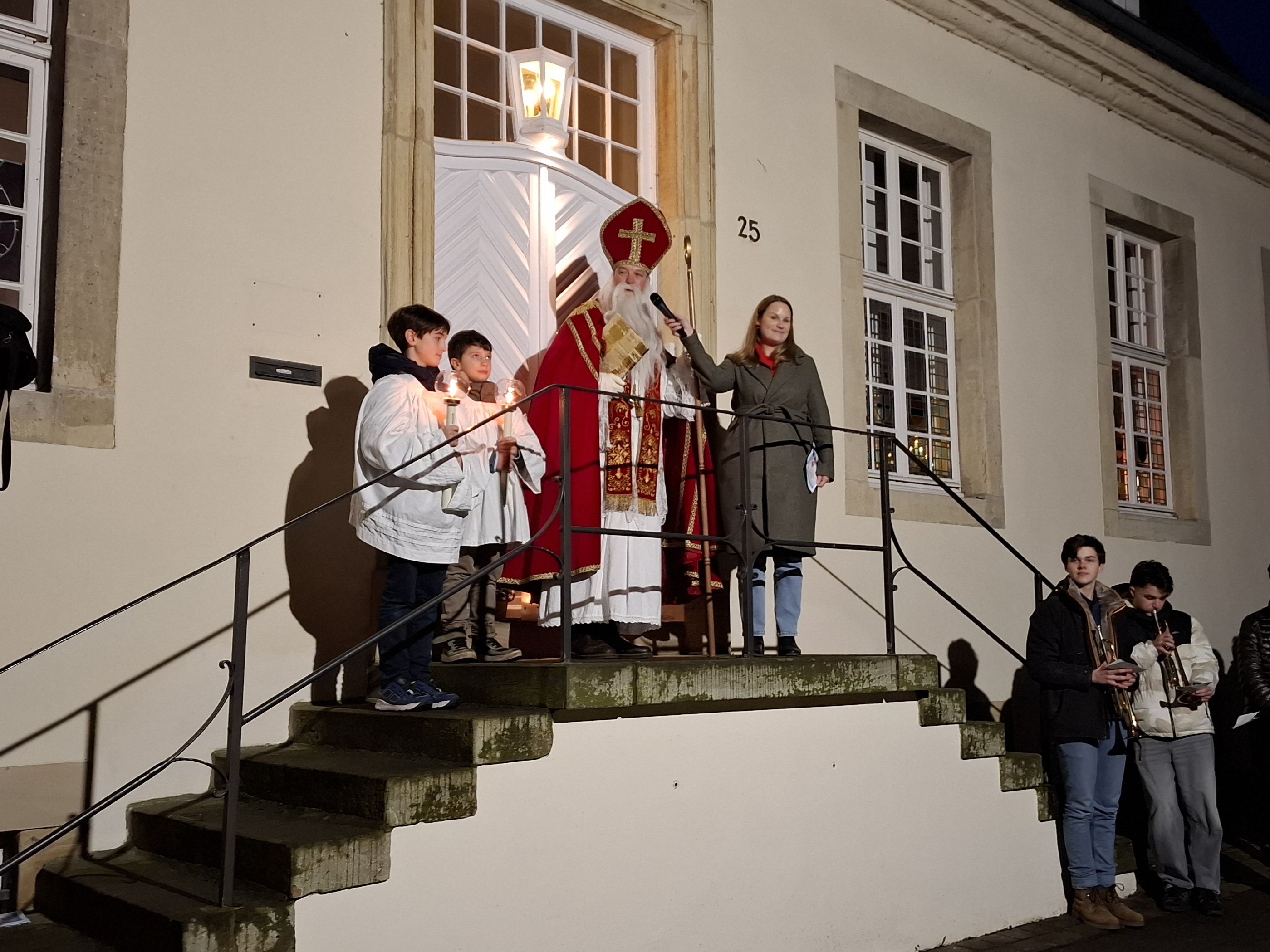 Er kam durch das Dunkel und wurde auf der Freitreppe vorm Pfarrhaus von vielen Kleinen und Großen begrüßt.